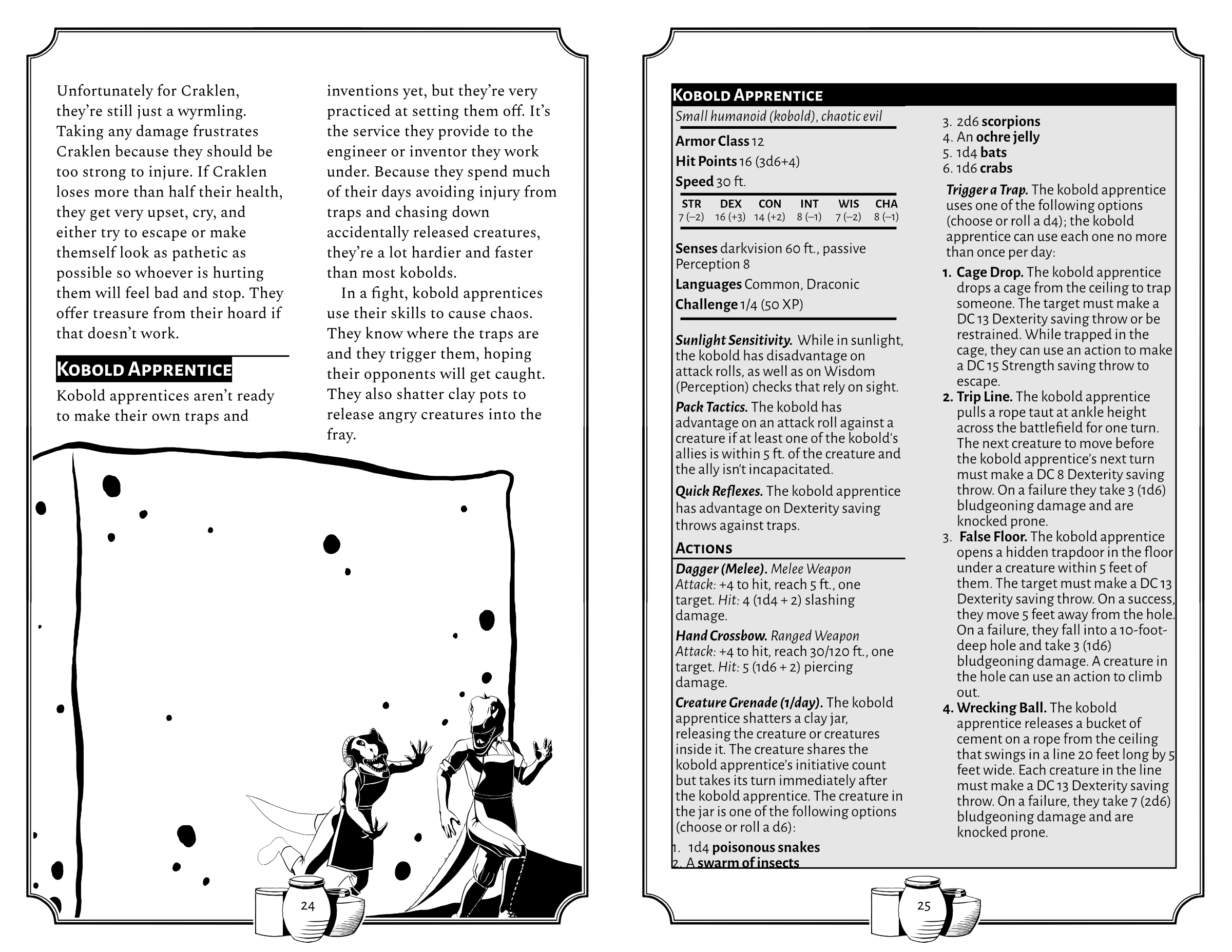 Unfortunately for the kobolds, many of their monsters grew larger than they were and decided that kobolds make tasty snacks. When they moved into Dragonscliff Keep, there were forty kobolds in their group. Half of them were eaten, including their lead engineer. Not only are the surviving kobolds terrified they’ll be eaten next, they don’t know how to avoid any of the traps their lead engineer built as no one can decipher her notes.